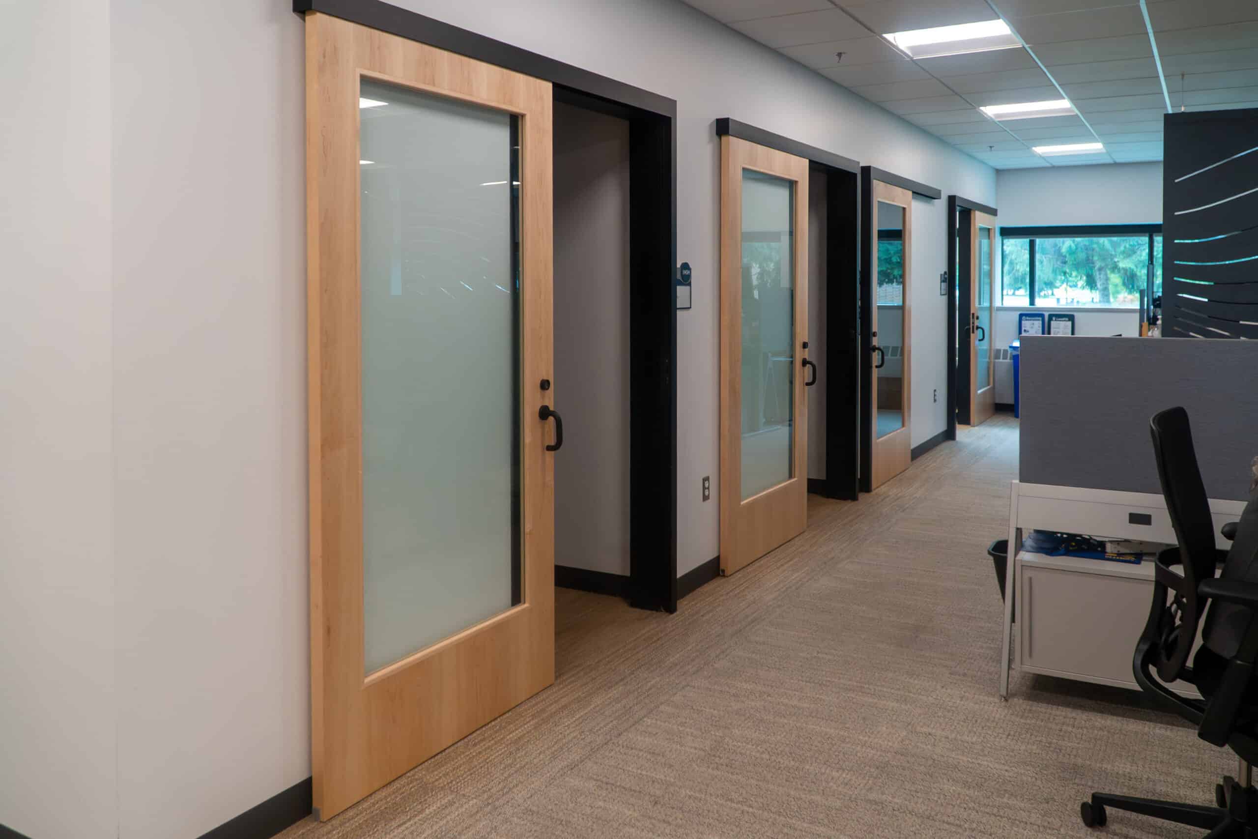 Neumann/Smith then designed adaptable, standardized offices that balanced functionality, comfort, and cost efficiency. As office footprints tightened — often to under 100 square feet — traditional swinging doors posed significant space-planning limitations.